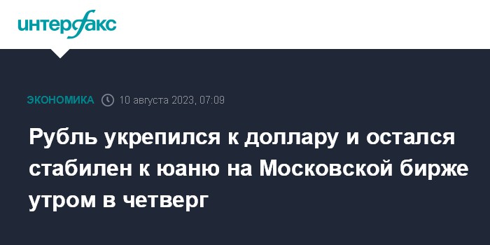 Москва. 10 августа. INTERFAX.RU - Доллар США слабеет, юань стабилен на Московской бирже утром в четверг, рубль укрепляется с учетом недавнего решения Банка России приостановить до конца года покупку валюты в рамках зеркалирования операций Минфина РФ.