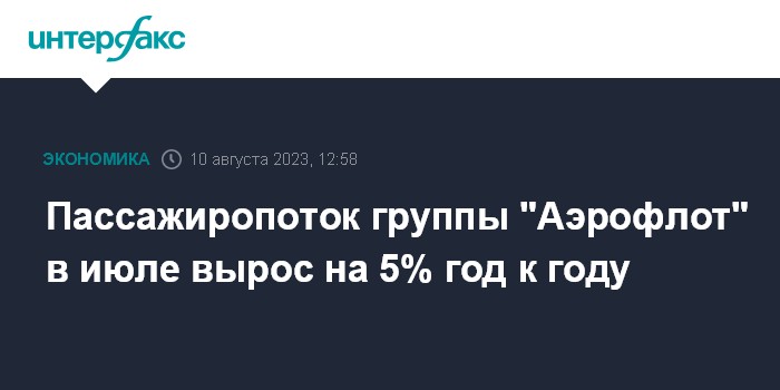Москва. 10 августа. INTERFAX.RU - Пассажиропоток группы "Аэрофлот" в июле 2023 года вырос на 5% относительно того же месяца прошлого года, до 5,1 млн человек, сообщила пресс-служба компании.