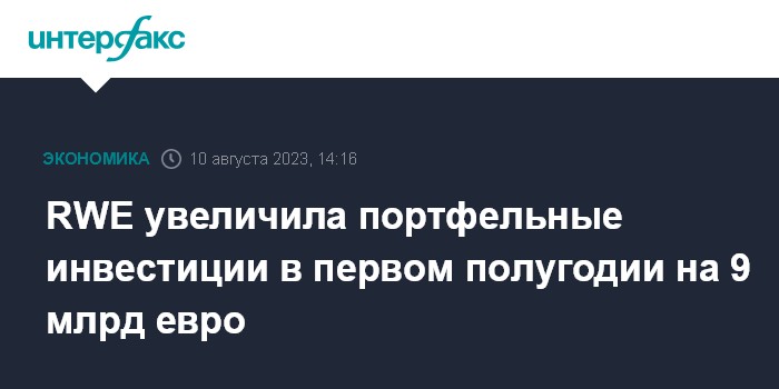 Москва. 10 августа. INTERFAX.RU - Германская энергетическая компания RWE AG увеличила портфельные инвестиции в первом полугодии 2023 года и показала сильные финансовые результаты. Инвестиции RWE, ее инвестиции за январь-июнь составили 9 млрд евро против 2,1 млрд евро годом ранее.