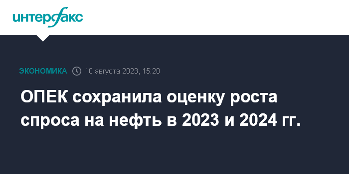 Москва. 10 августа. INTERFAX.RU - Спрос на нефть в 2023 году вырастет на 2,44 млн баррелей в сутки к 2022 году - до 102,01 млн б/с, а в 2024 году увеличится еще на 2,25 млн б/с - до 104,25 млн б/с, следует из ежемесячного отчета ОПЕК.