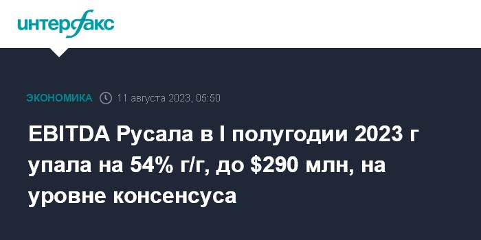 EBITDA Русала в I полугодии 2023 г упала на 54% г/г, до $290 млн, на уровне консенсуса