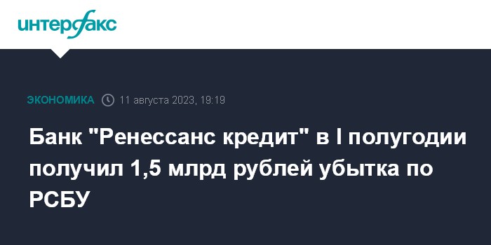 Банк "Ренессанс кредит" в I полугодии получил 1,5 млрд рублей убытка по РСБУ