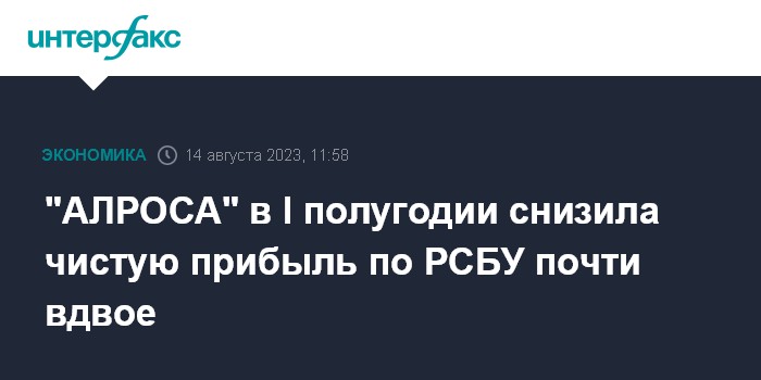 Москва. 14 августа. INTERFAX.RU - "АЛРОСА" в I полугодии 2023 года снизила чистую прибыль по РСБУ в 1,9 раза по сравнению с аналогичным периодом прошлого года, до 44,1 млрд рублей, следует из отчетности компании.