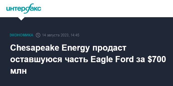 Москва. 14 августа. INTERFAX.RU - Американская Chesapeake Energy подписала соглашение о продаже оставшейся части техасского сланцевого месторождения Eagle Ford вместе с сопутствующими основными средствами за $700 млн компании SilverBow Resources, говорится в пресс-релизе Chesapeake.