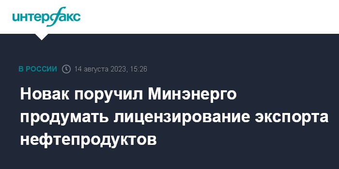 Москва. 14 августа. INTERFAX.RU - Вице-премьер Александр Новак поручил Министерству энергетики рассмотреть вопрос лицензирования экспорта нефтепродуктов, сообщили "Интерфаксу" источники, знакомые с ситуацией.