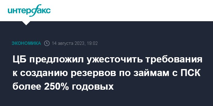 Москва. 14 августа. INTERFAX.RU - ЦБ РФ предлагает изменить подход к формированию резервов на возможные потери по займам: они будут формироваться не в зависимости от срока и суммы займа (до 30 тыс. до 30 дней), а в зависимости от размера полной стоимости кредита (250% и более).