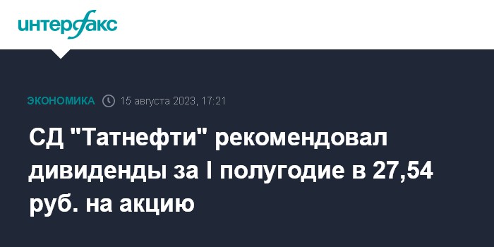 Москва. 15 августа. INTERFAX.RU - Совет директоров "Татнефти" на заочном заседании рекомендовал акционерам утвердить на внеочередном собрании дивиденды за первое полугодие 2023 года в размере 27,54 рубля на акцию, говорится в сообщении компании.