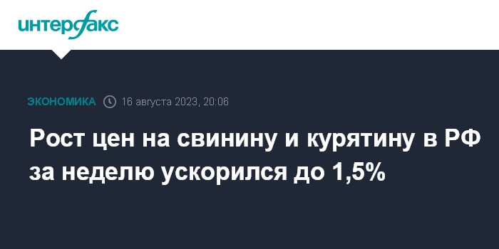 Москва. 16 августа. INTERFAX.RU - Потребительские цены на свинину в РФ за неделю с 8 по 14 августа выросли на 1,54%, на мясо кур - на 1,53%, сообщил Росстат в среду.