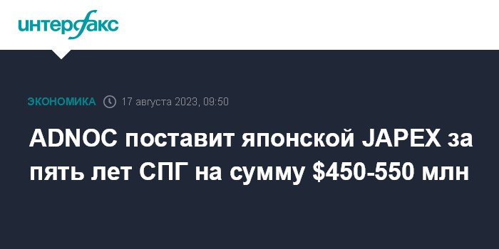 Москва. 17 августа. INTERFAX.RU - Национальная нефтяная компания Абу-Даби (АDNOC) Gas plc, заключила пятилетнее соглашение о поставках сжиженного природного газа с японской энергетической компанией Japan Petroleum Exploration Co., Ltd., сообщила ADNOC.
