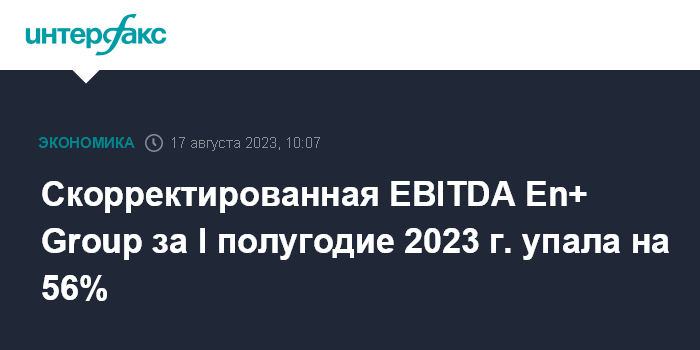 Москва. 17 августа. INTERFAX.RU - Скорректированная EBITDA En+ Group за первое полугодие 2023 года упала на 56% к данным годичной давности, до $1,046 млрд, сообщила компания.