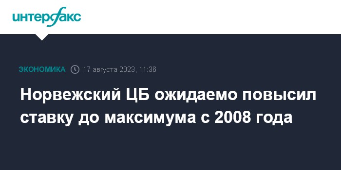 Москва. 17 августа. INTERFAX.RU - Норвежский центробанк повысил ключевую процентную ставку на 25 базисных пунктов (б.п.), до 4% годовых. Это решение совпало с прогнозом экспертов, опрошенных Trading Economics. Уровень ставки обновил максимум с 2008 года.