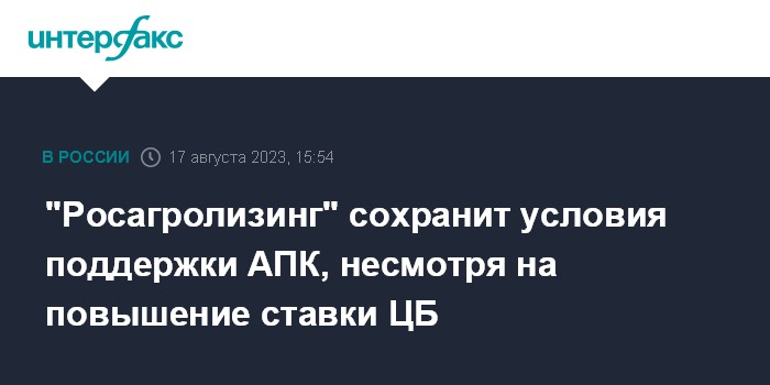 Москва. 17 августа. INTERFAX.RU - "Росагролизинг" не будет пересматривать льготные условия программ поддержки аграриев после повышения ключевой ставки ЦБ, сообщил замгендиректора компании Дмитрий Крамаренко.