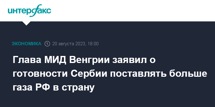 Москва. 20 августа. INTERFAX.RU - Сербская сторона будет готова нарастить поставки российского газа в Венгрию, если Украина решит прекратить транзит этого энергоресурса из РФ, заявил в воскресенье глава венгерского МИД Петер Сийярто.