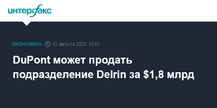 Москва. 21 августа. INTERFAX.RU - Американская химическая компания DuPont de Nemours Inc. ведет переговоры с фондом прямых инвестиций The Jordan Company (TJC) о продаже ему подразделения Delrin за $1,8 млрд, сообщает Bloomberg со ссылкой на информированные источники.
