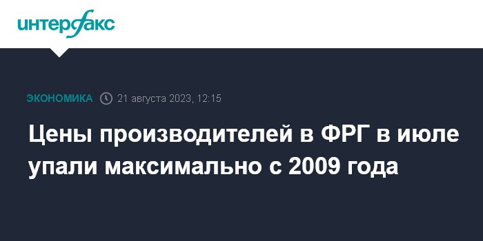 Москва. 21 августа. INTERFAX.RU - Цены производителей в Германии в июле упали на 6% в годовом выражении после повышения на 0,1% в июне, сообщило статистическое управление Destatis. Снижение показателя является максимальным с 2009 года, отмечает Financial Times.