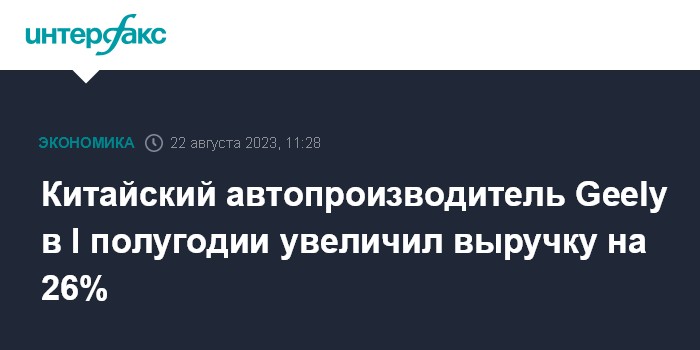 Москва. 22 августа. INTERFAX.RU - Один из крупнейших китайских автопроизводителей Geely Automobile Holdings Ltd в первом полугодии увеличил выручку на 26% год к году благодаря значительному росту продаж электромобилей.