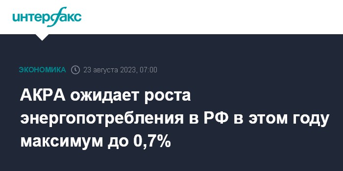 Москва. 23 августа. INTERFAX.RU - АКРА улучшило свой прогноз по энергопотреблению в России в этом году, сообщило агентство.