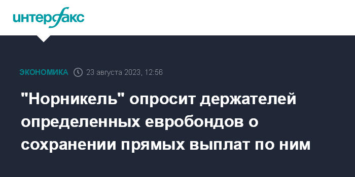 "Норникель" осенью 2022 года получил согласие держателей всех выпусков евробондов компании на осуществление прямых выплат по ним. Сейчас у "Норникеля" в обращении находятся три выпуска еврооблигаций - с погашением в 2024, 2025 и 2026 годах.