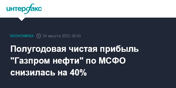 Москва. 24 августа. INTERFAX.RU - В I полугодии 2023 года чистая прибыль "Газпром нефти" по МСФО составила 304,413 млрд рублей, что на 40% ниже показателя за январь-июнь 2022 года (508,331 млрд рублей), говорится в отчете компании.
