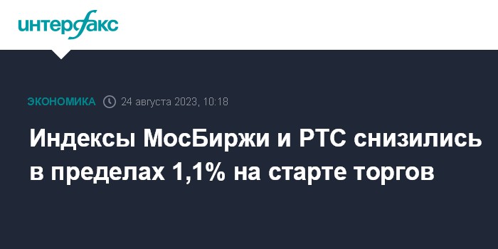 Индексы МосБиржи и РТС снизились в пределах 1,1% на старте торгов