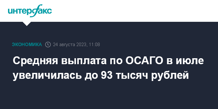Москва. 24 августа. INTERFAX.RU - Размер средней выплаты по ОСАГО в июле 2023 года оказался самым высоким с начала года и достиг 93 тысячи рублей, сообщает Российский союз автостраховщиков (РСА) со ссылкой на президента союза Евгения Уфимцева.