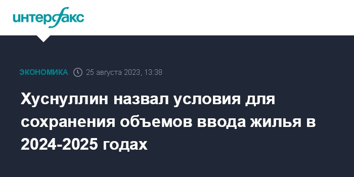Москва. 25 августа. INTERFAX.RU - Вице-премьер Марат Хуснуллин назвал ипотеку и индивидуальное жилищное строительство (ИЖС) предпосылками для сохранения объемов ввода жилья в 2024-2025 годах.
