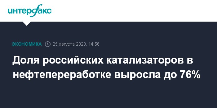 Москва. 25 августа. INTERFAX.RU - Доля применения отечественных катализаторов на российских нефтеперерабатывающих заводах увеличилась до 76% по сравнению с 32% в 2014 году, сообщил через пресс-службу Минэнерго директор Департамента нефтегазового комплекса Антон Рубцов.