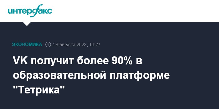 Москва. 28 августа. INTERFAX.RU - VK увеличит долю в онлайн-платформе "Тетрика" до более 90%, сообщила компания.