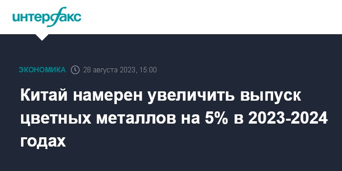 Москва. 28 августа. INTERFAX.RU - Китай намерен сохранить устойчивые темпы наращивания производства цветных металлов в текущем и следующем годах, сообщило Министерство промышленности и информатизации. Ведомство ожидает, что выпуск десяти основных цветных металлов вырастет примерно на 5% в 2023-2024 годах, передает "Синьхуа".
