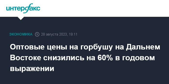 Москва. 28 августа. INTERFAX.RU - Оптовая цена горбуши на Дальнем Востоке, по данным на 27 августа, составила 155 рублей за кг, что на 60% ниже, чем на аналогичную дату прошлого года, сообщает Рыбный союз со ссылкой на мониторинг ФГУП "Нацрыбресурс".