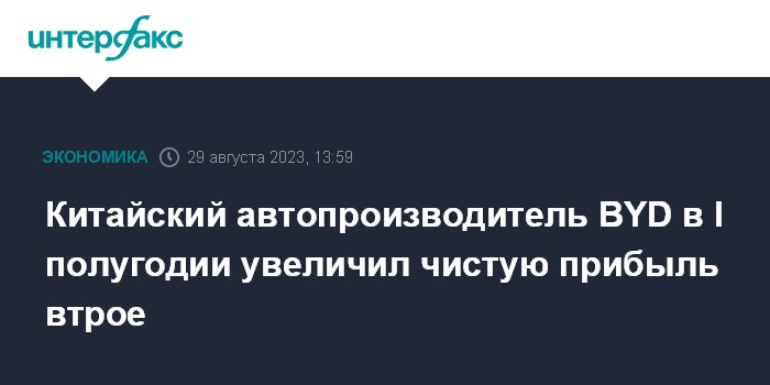 Москва. 29 августа. INTERFAX.RU - Китайская BYD Co. Ltd., ведущий производитель автомобилей на новых источниках энергии (NEV) в стране, в первом полугодии 2023 года увеличила чистую прибыль в три раза благодаря росту продаж машин.