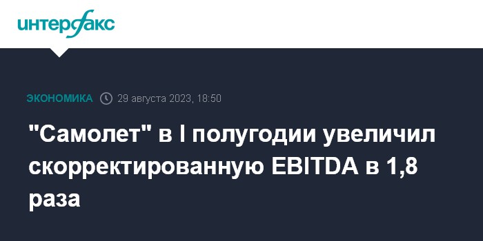 Москва. 29 августа. INTERFAX.RU - Девелопер "Самолет" в I полугодии 2023 года увеличил скорректированную EBITDA по МСФО в 1,8 раза до 33,1 млрд рублей, свидетельствует отчетность компании.