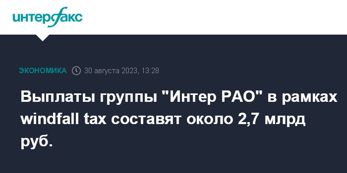 Москва. 30 августа. INTERFAX.RU - Группа "Интер РАО" заплатит около 2,7 млрд рублей в рамках windfall tax.