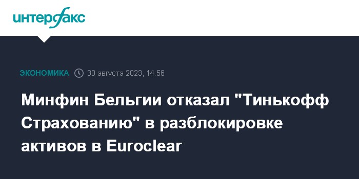 Москва. 30 августа. INTERFAX.RU - Компания "Тинькофф Страхование" получила отказ от Минфина Бельгии на разблокировку собственных активов на счетах НРД в европейском депозитарии Euroclear, сообщили "Интерфаксу" в пресс-службе "Тинькофф".