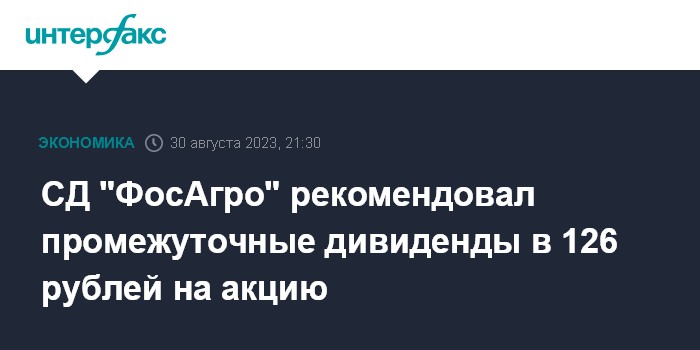Москва. 30 августа. INTERFAX.RU - Совет директоров "ФосАгро" рекомендовал дивиденды по результатам I полугодия 2023 года из расчета 126 рублей на акцию, сообщила компания.