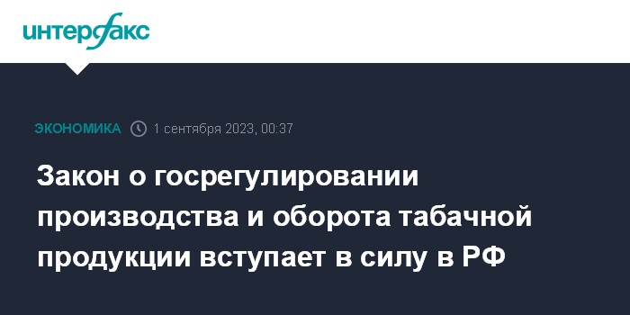 Москва. 1 сентября. INTERFAX.RU - Табачная отрасль РФ с 1 сентября этого года начинает жить по собственному закону - вступает в силу закон "О государственном регулировании производства и оборота табачных изделий, табачной продукции, никотинсодержащей продукции и сырья для их производства".