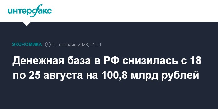 Денежная база в РФ снизилась с 18 по 25 августа на 100,8 млрд рублей