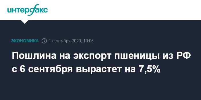 Пошлина на экспорт пшеницы из РФ с 6 сентября вырастет на 7,5%