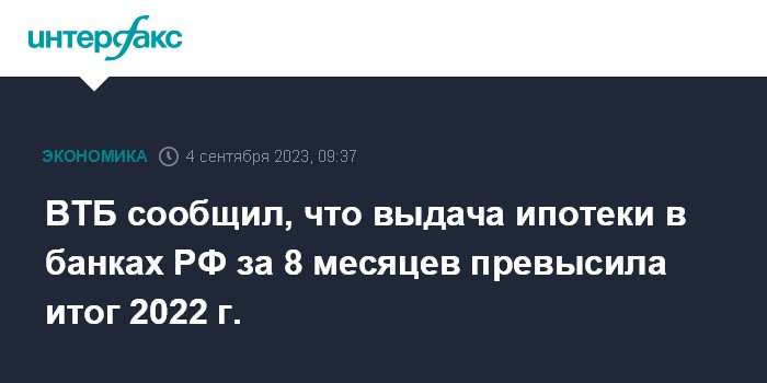 ВТБ сообщил, что выдача ипотеки в банках РФ за 8 месяцев превысила итог 2022 г.