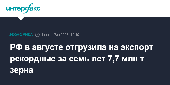 Москва. 4 сентября. INTERFAX.RU - РФ в августе этого года отгрузила на экспорт 7,7 млн тонн зерна, сообщается в мониторинге Российского зернового союза.