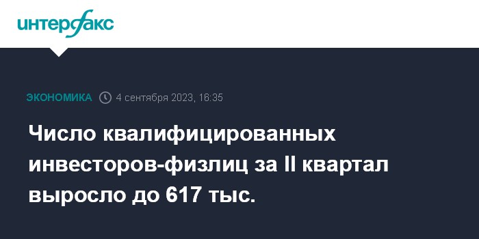 Москва. 4 сентября. INTERFAX.RU - Количество квалифицированных инвесторов во втором квартале 2023 года достигло 617 тыс. человек, увеличившись на 39% в годовом выражении и на 5% - в квартальном. Об этом говорится в "Обзоре ключевых показателей профессиональных участников рынка ценных бумаг" Банка России.