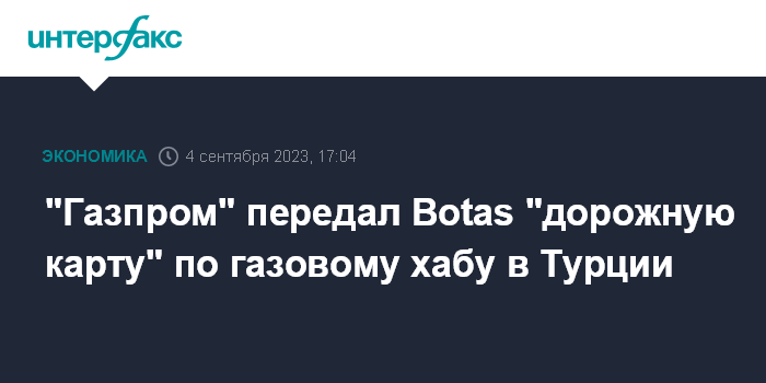 Москва. 4 сентября. INTERFAX.RU - "Газпром" передал турецкой газовой компании Botas "дорожную карту" по газовому хабу в Турции, сообщил президент России Владимир Путин на пресс-конференции по итогам переговоров с президентом Турции Реджепом Тайипом Эрдоганом.