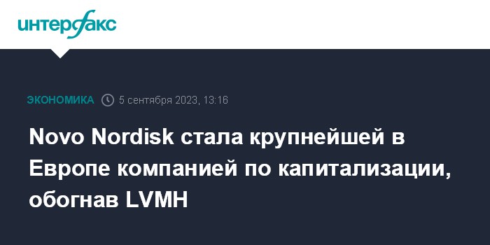 Москва. 5 сентября. INTERFAX.RU - Датская фармацевтическая компания Novo Nordisk стала крупнейший в Европе по капитализации, обогнав французского производителя потребительских товаров класса люкс LVMH Moet Hennessy Louis Vuitton.