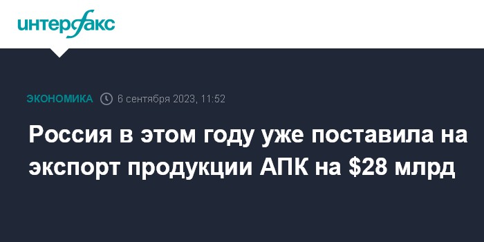 Москва. 6 сентября. INTERFAX.RU - Россия в текущем году уже экспортировала продукции АПК на $28 млрд, сообщил министр сельского хозяйства Дмитрий Патрушев на совместном заседании комитетов Госдумы по контролю и аграрным вопросам в среду. На заседании рассматривался Национальный доклад о ходе выполнения госпрограммы развития сельского хозяйств