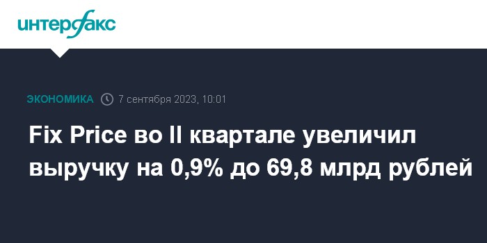 Москва. 7 сентября. INTERFAX.RU - Выручка Fix Price во II квартале выросла на 0,9% по сравнению с аналогичным периодом прошлого года и составила 69,8 млрд рублей, говорится в сообщении компании.