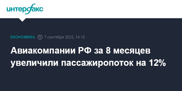 Москва. 7 сентября. INTERFAX.RU - Авиакомпании РФ за восемь месяцев 2023 года увеличили пассажиропоток, по предварительным данным, на 12% относительно того же периода прошлого года, до 70,8 млн человек, сообщила Росавиация.