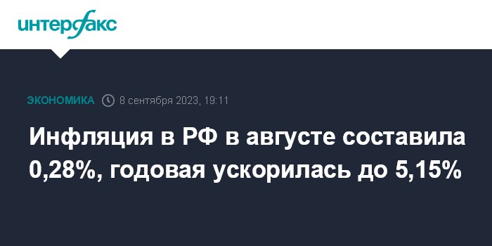 Инфляция в августе 2023 года совпала с ожиданиями аналитиков - консенсус-прогноз экономистов по инфляции на август, подготовленный "Интерфаксом", равнялся 0,3%.