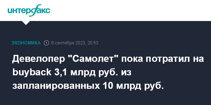 Москва. 8 сентября. INTERFAX.RU - "Самолет" в рамках одобренной советом директоров программы buyback по состоянию на среду выкупил бумаги на общую сумму 3,125 млрд рублей.