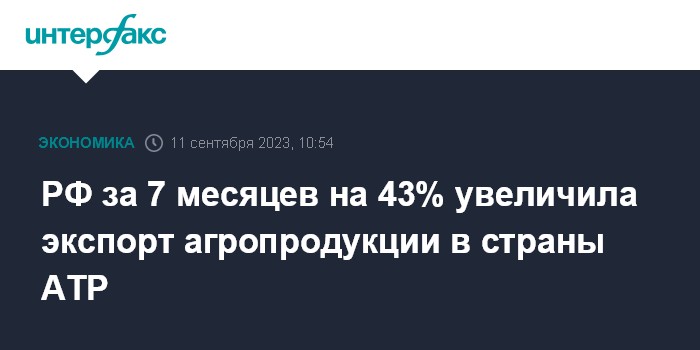 Москва. 11 сентября. INTERFAX.RU - РФ за 7 месяцев 2023 года экспортировала в страны Азиатско-Тихоокеанского региона продукции АПК более чем на $6 млрд, что на 43% превышает показатель годом ранее. Основным покупателем стал Китай. Об этом сообщил директор департамента международных отношений и развития экспорта продукции АПК Минсельхоза РФ Максим Маркович на Восточном экономическом форуме.