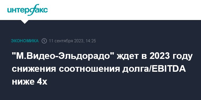 Москва. 11 сентября. INTERFAX.RU - Группа "М.Видео-Эльдорадо" ожидает на конец 2023 года снижения соотношения чистого долга к EBITDA на уровне ниже 4х, сообщила в интервью "Интерфаксу" финансовый директор группы Анна Гарманова.